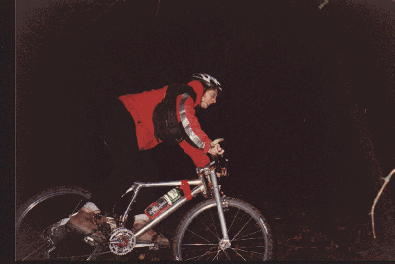 Dancing flames and Lunar light The dinner scene faded and the bikers prepared for the next stage of extraordinary fun. Shortly after descending from Turk's head, after bashing through some brush that encroaches on the trail and finding the invisible doorway. the fools began the big drop. It starts out as a nearly level field of grass that travels past some beautiful oaks. Then it drops in a couple of steps, each becoming steeper than the one before. Finally the last pitch defies rideablity. It is about as steep as a bike can be ridden. Not all make it. Once down the giant steps, the nature of the ride changes dramatically. The trail is only slightly downhill but it hangs precariously on the side of the steep flank of mountain. The pitch is so steep that it is disorienting and hard to keep balance. Especially in the daytime. At night one has the advantage of not being able to accurately judge the immense hazard that exists. All of the bikers made their way across the hillside. The intensity of the moon is greatest on this part of the ride. The grassy hills light up and the path (as narrow as it is) is easy to see. The views to the south and west are magnificent. The peak of Mt.St. Helen towers above the trail and the Palisades are in clear view to the southeast.