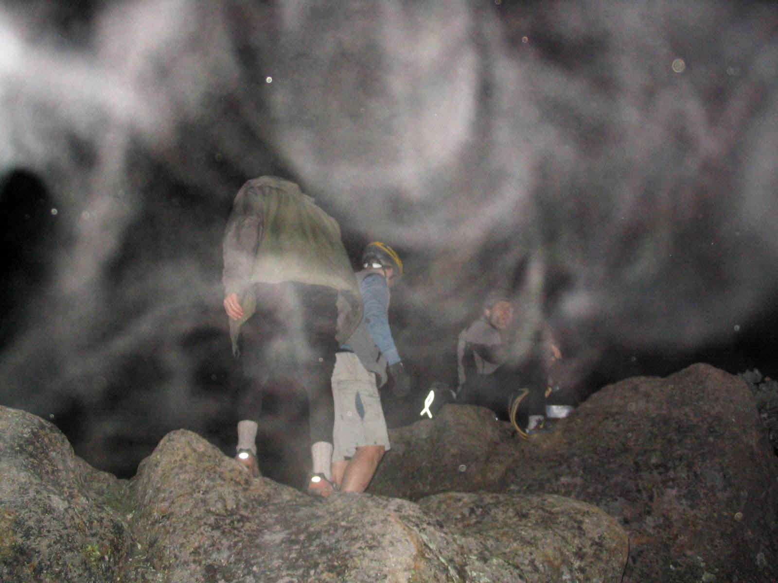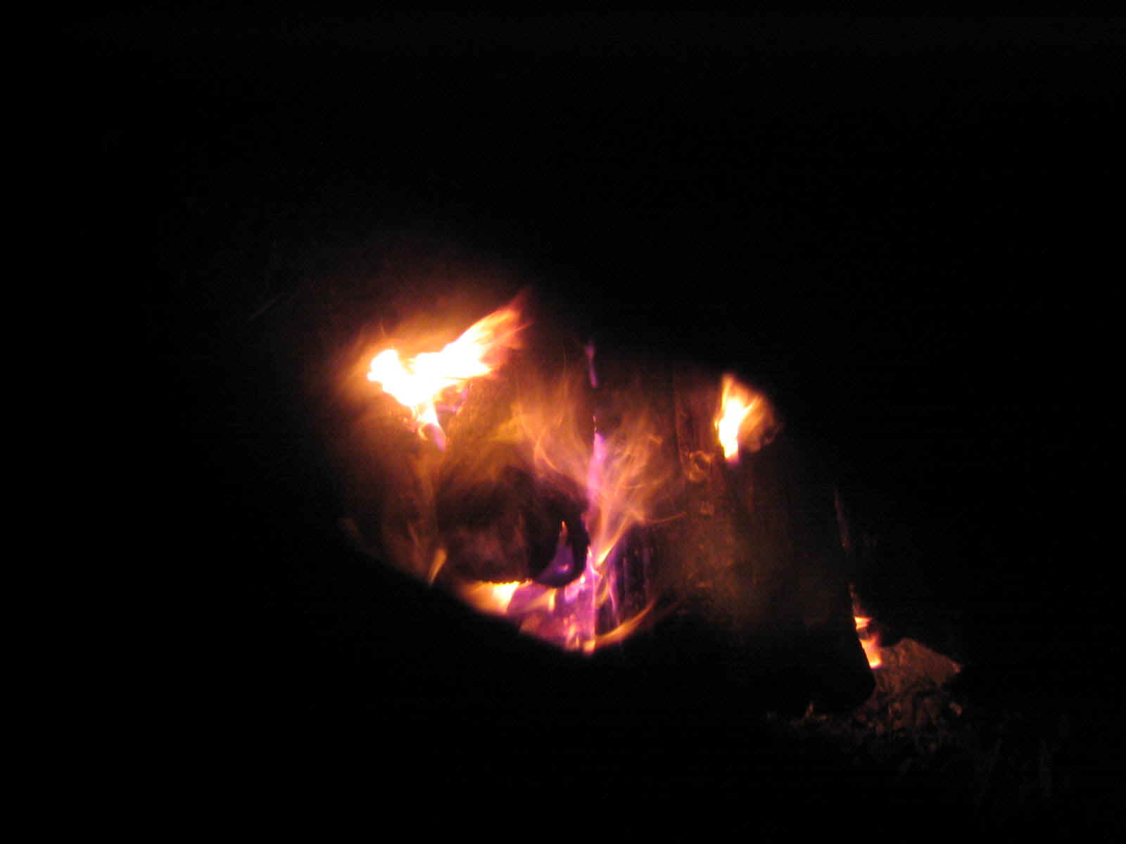 The group proceeded the rest of the way to the dinner spot. Wood was ample and a fire was quickly lit. To add levity, Eric produced several bottle rockets and sent them skyward, each with varying results, each entertaining.