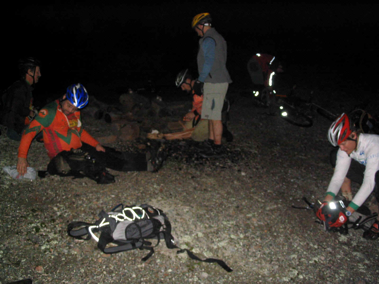 In seemingly no time, the bikers had finished with dinner, the fire had been Daved and all that was left was the return trip on a more civilized road. The ride was a huge success. Not only did the core lunatistas make the call, but so also did the weather by providing the only clear night in several weeks. It was among the great rides under the watchful eye of La Luna.