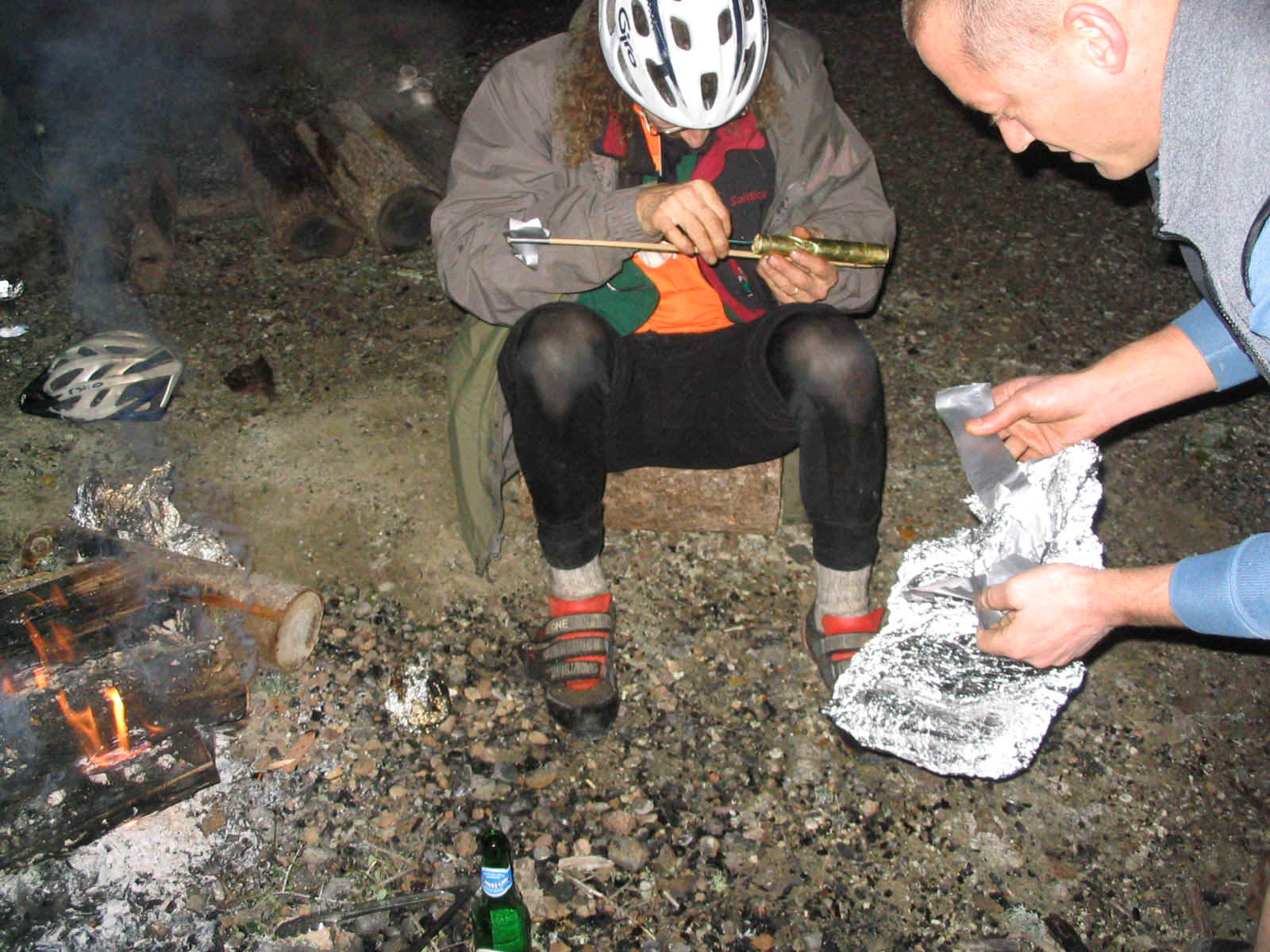 A grand assortment of food nourished the riders. There was Portobello mushrooms, steak, seasoned zuchini, baked apples and desert. The fire warmed the spirit and provided entertainment. Two bottles of champagne appeared and several rounds of sipping the bubbly grape juice followed. There was no shortage of beverage. Perhaps it was the champagne, but a phenomenal round of farting began. It ranged from the popular dual tone blast to the scary whisper. The fun was going out of control.