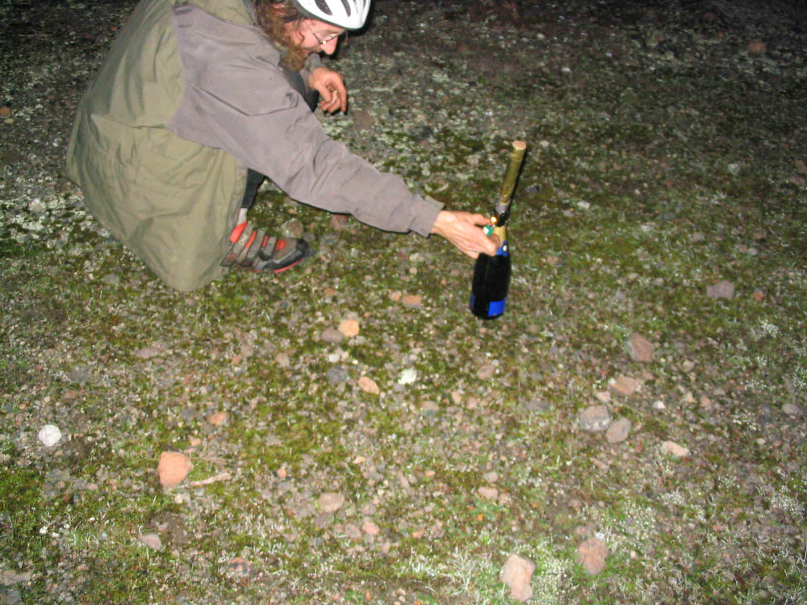 When the bodies and food were sated, Mike produced the grand daddy of bottle rockets. It had sustained some damage enroute and was of questionable airworthiness. It was anyones guess as to what might happen.