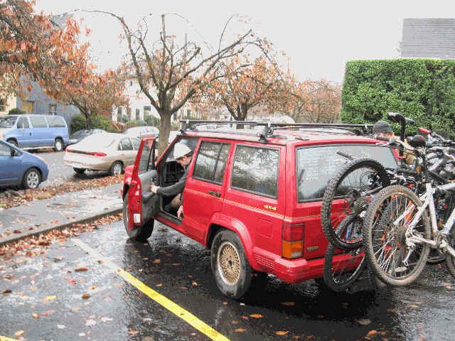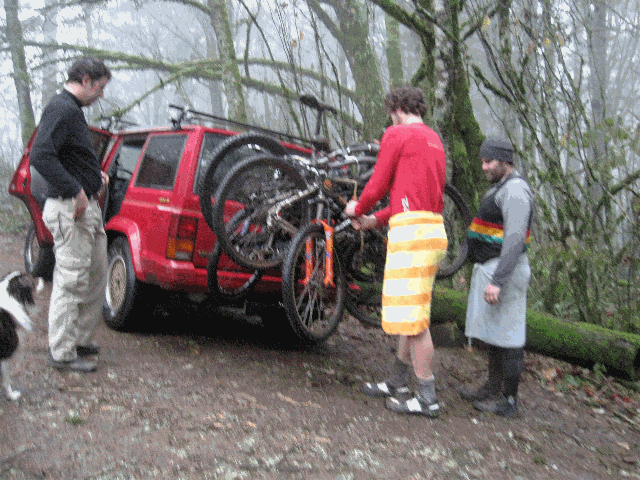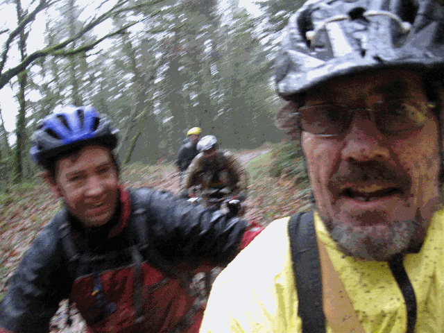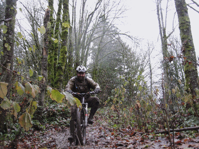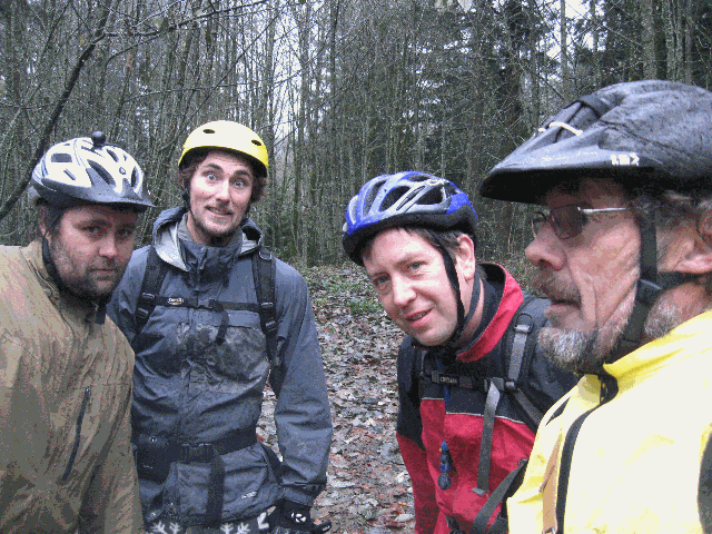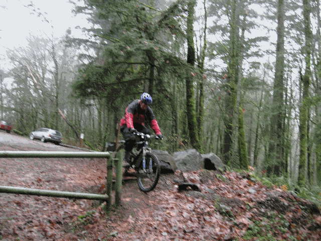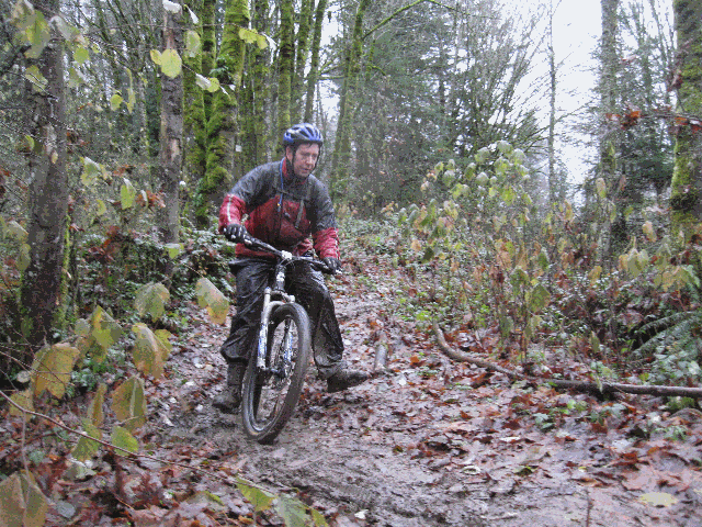 The group convened near downtown Portland. After loading into Seb's car the group headed to the hills. The rain was light and the temperature was chilly but not cold. After the usual preparations and clothing adjustments, the group headed down the trail. The first of several safety briefings occured at the top of the first drop.